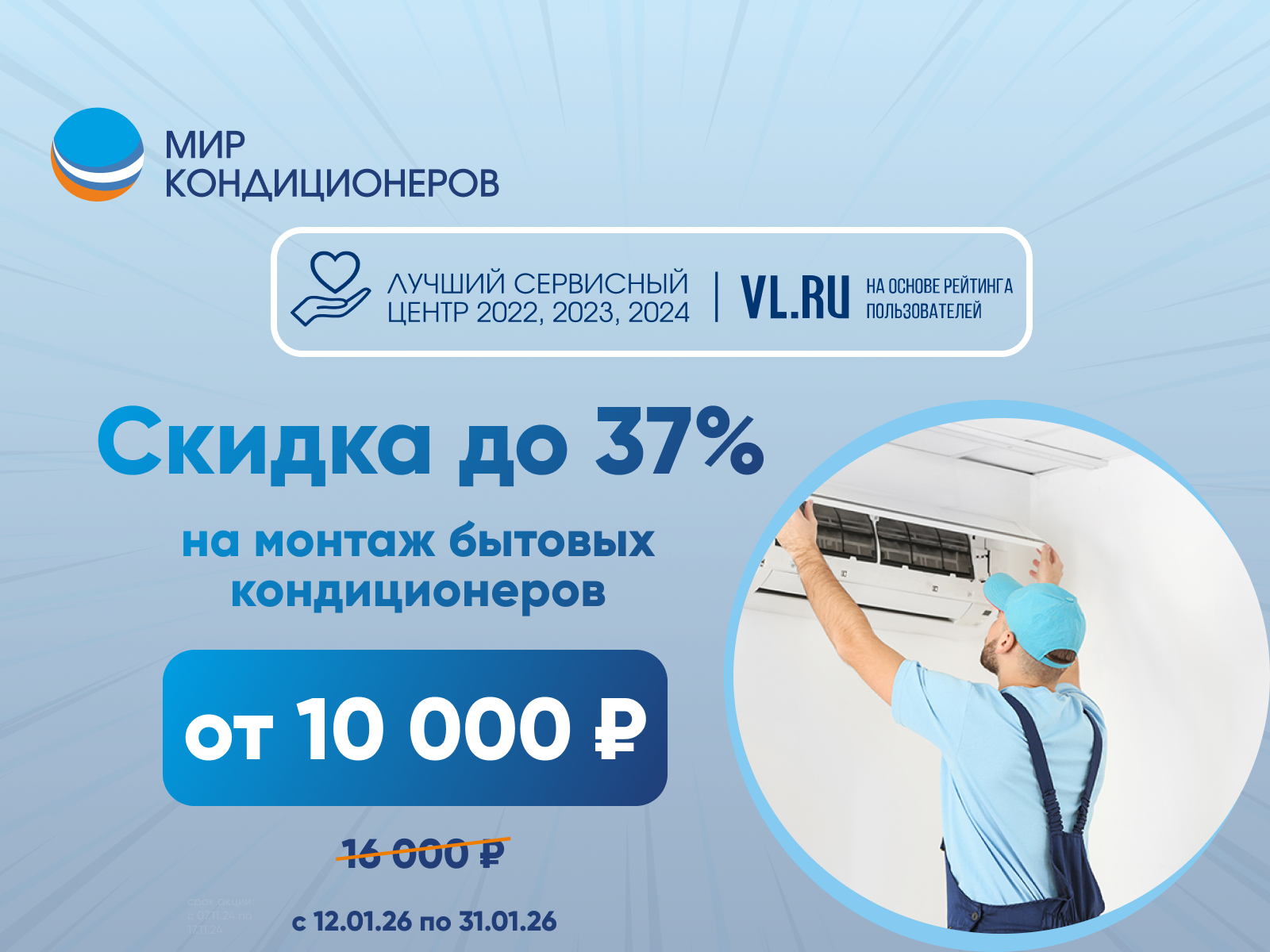 Акция действует на кондиционеры всех мощностей, приобретенные с монтажом в компании "Мир кондиционеров".