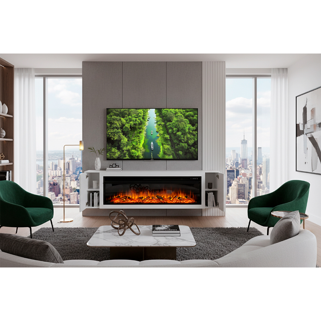 Madison — это портал-тумба, который сочетает в себе две функции: обрамляет электрический очаг Royal Flame и обеспечивает дополнительное место хранения. Портал идеально подходит для установки под телевизором в гостиной. Теперь не нужно выбирать между камином и ТВ-тумбой.