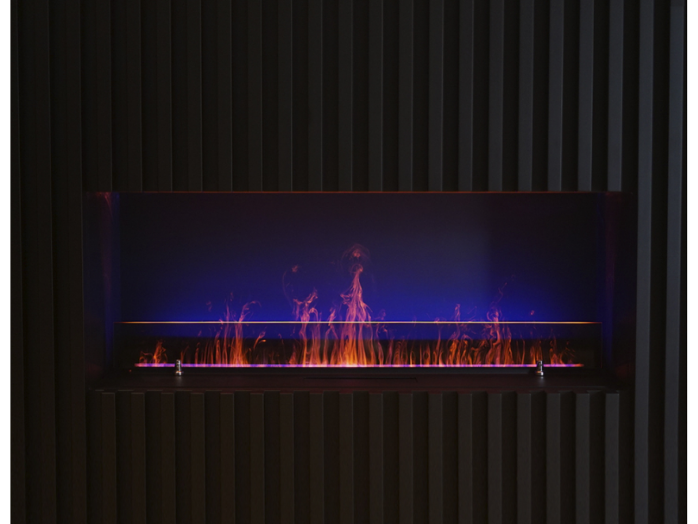 Синяя подсветка придает пламени особый цвет, пламя становится таким, как будто горит голубое топливо, язычки пламени становятся с розово-синем оттенком. Выглядит это необычно и очень красиво.